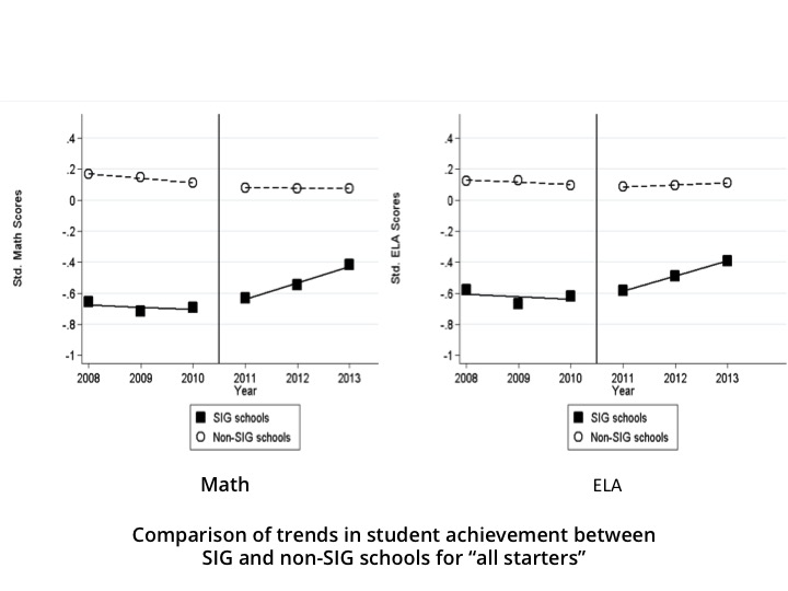 The lowest-performing schools saw increased average student achievement in math and English language arts (ELA), with the gap between these turnaround schools and the rest of the district narrowing from 0.80 standard deviations (SD) in spring 2010 (right before the reform) to 0.50 SD in the third year of SIG efforts.