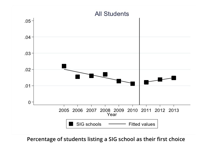 Family preferences. The percent of families listing a SIG school as their first choice was decreasing in the years prior to reform efforts but began to increase after reforms were implemented. In the first year of reform, the odds that students selected a SIG school as their first choice significantly increased by 31 percent relative to the odds of making the same choice before the intervention, after accounting for student characteristics, distance from their home to the school, and school fixed effects. The odds that students listed a SIG school as their first choice increased by 65 percent in year 2 and 117 percent in year 3. This same pattern was seen among high-achieving students.