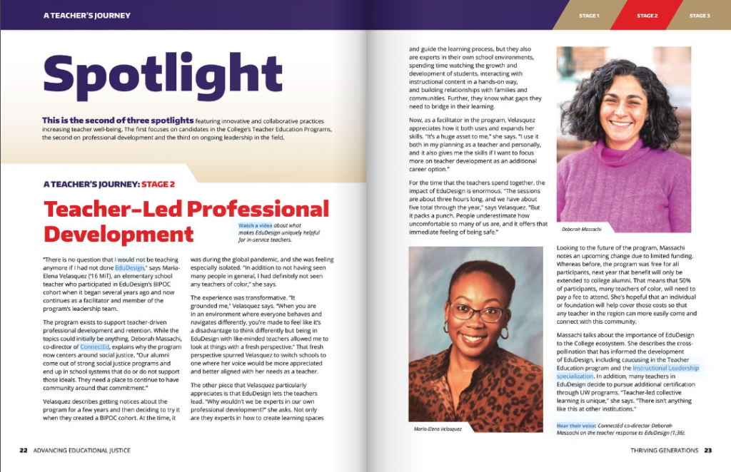 Join us to learn about EduDesign Learning Communities, a uniquely collaborative approach to teacher professional development. Teaching is complex and relational work. Teachers need spaces to grapple with the important challenges they face. In this panel discussion we’ll explore the EduDesign model as a peer-to-peer education strategy to support ongoing learning, wellbeing, and retention for justice-focused teachers and Black, Indigenous, and teachers of Color in their first years and beyond. We’ll hear from organizers, teacher-leaders, and participants about their experiences in these collective learning communities.